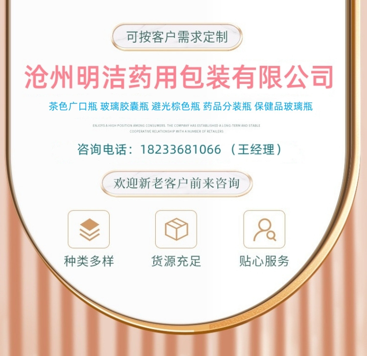 滄州明潔關(guān)注于保健品玻璃瓶,藥品分裝瓶,棕色藥瓶,茶色膠囊瓶,棕色膠囊瓶,玻璃密封瓶,棕色廣口瓶,避光膠囊瓶,廣口藥品瓶,茶色玻璃膠囊瓶,茶色片劑瓶,棕色藥瓶,保健品玻璃瓶,廣口藥品瓶,藥片瓶,產(chǎn)品規(guī)格多,款式新穎,品質(zhì)過硬。