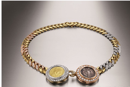 復古經(jīng)典和當代美學相結合的_項鏈,螺旋形狀的項鏈,金銀銅色不斷轉變,以金屬和鉆石打造出立體感,中間的裝飾是兩顆古羅馬錢幣,拜占庭的輝煌雍容盡顯其中。人頭圖像外邊一圈鉆石裝飾,在歲月的流轉中盡顯華貴。Monete系列當時_成為了明星華貴喜歡的款式。