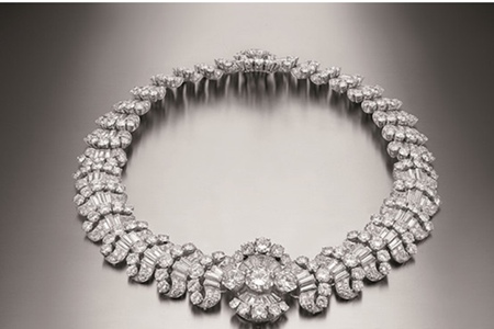 經(jīng)典的鉑金項鏈幾何造型_,嚴謹?shù)膶W院風,一脈相承的典雅,1959年的這條項鏈,運用了大量的鉑金,法式風格_。顆粒和條形相契合,中間的花形以大顆圓形作為焦點,其他鉆石圍繞綻放,整體是一個圓潤的弧形耀眼奪目。
